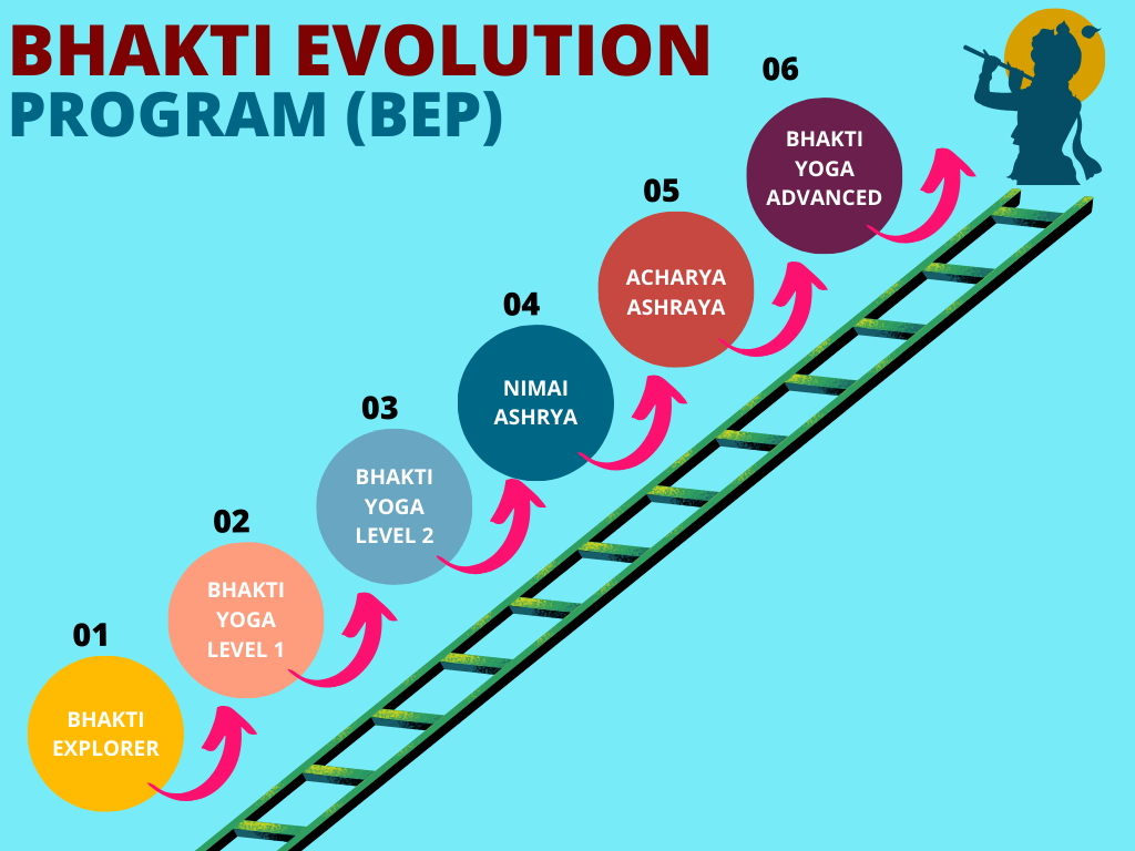 The Bhakti Evolution Program (BEP) aims to promotes a natural progression in bhakti yoga. It outlines a set of personal goals associated with different levels of Bhakti Step, focusing on daily chanting of the Hare Krishna maha-mantra, studying bhakti philosophy, participating in various bhakti practices, and personal development.